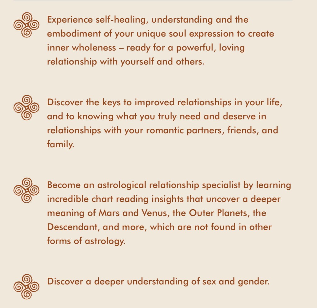 In this amazing and powerful TOTAMS Shamanic Astrology course, you will: -Experience self-healing, and create inner wholeness while learning to understand and embody your unique soul expression – ready for a powerful, loving relationship with yourself and others. -Discover the keys to improving relationships in your life, and knowing what you truly need and deserve in relationships with your romantic partners, friends, and family. -Become an astrological relationship specialist by learning incredible chart reading insights into the deeper meanings of Mars and Venus, the Outer Planets, the Descendant, and more.